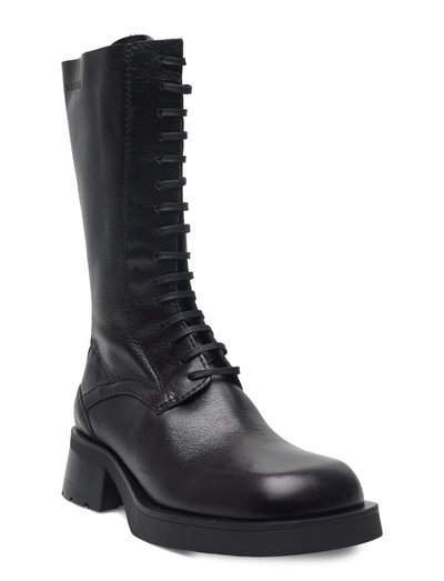 Snörningen möter en robust silhuett i dessa slående stövlar. Tillverkade med en stadig blockklack och en distinkt manchestertextur, erbjuder de både stil och stabilitet. Det höga skaftet tillför en touch av dramatik, vilket gör dem till ett mångsidigt val för olika outfits.