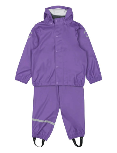 VattentätMikk-lines classic PU rainwear set with suspenders. This rainwear set is made of waterproof fabric from 100% recycled PU material, and it is designed for children to have fun in the rain, jumping puddles, sliding down the wet slide, playing in the wet sandbox etc. Place the adjustable foot straps underneath the wellies/boots to prevent the pants from sliding up and keep the feet dry. The set also features a name tag with room for more than one name, so please pass it on and let it be re-loved. EXCELLENT & FUNCTIONAL DESIGN- Solid-coloured.- Adjustable braces/suspenders with click buckles. - Fleece lining around the neckline.- Smooth-running YKK zipper with pull tab.- Zipper coverage. - Chin protection (zipper garage).- Elasticated cuffs at hands and feet.- Detachable hood with snap buttons.- Adjustable foot straps. - Strong reflective details. - Name tag. TECHNICAL ADVANTAGES- 100% recycled PU plastic. - Waterproof fabric and welded seams (water pressure 5,000 mm). - Windproof.- Wear-resistant material. - Easy-to-clean.- Dirt repellent. - Nickel-free.- OEKO-TEX® Standard 100, Class 1
