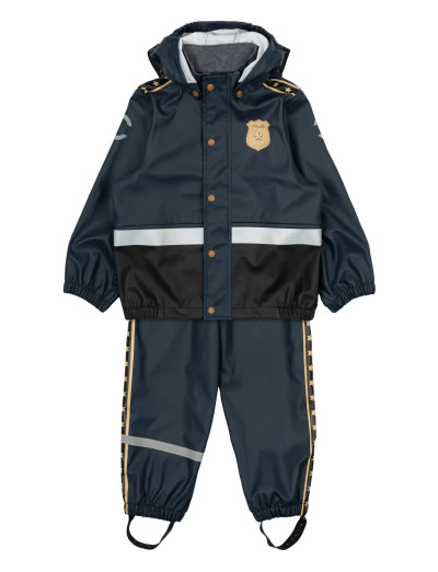 VindtätSmart rainwear from mikk-line featuring a cool police design. The set includes a waterproof rain jacket and rain pants. This rainwear is designed for children to brave the rain and enjoy jumping in puddles, sliding down wet slides, playing in the wet sandpit, and more. Adjust the foot straps under the boots to keep feet dry and prevent the pants from riding up.