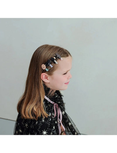 4 pairs of mini hair clips with blacks cats, stars, pumpkins and witches. Age: 3-8 yrs