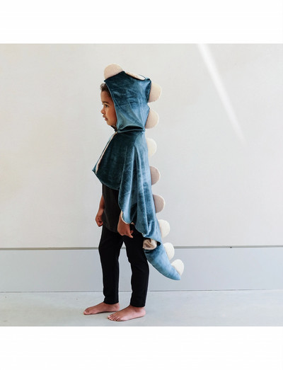 Cute, green dino cape provided with tale and hood with golden decoratione. Age: 3-8 yrs