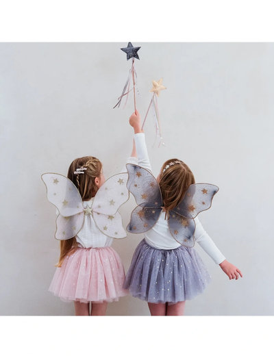 Spread star dust with this fine magic wand, where the padded, grey top star has glitter silver star decoration and 6 beautiful satin ribbons attached. The star is placed securely on a stick, upholstered in satin ribbon.