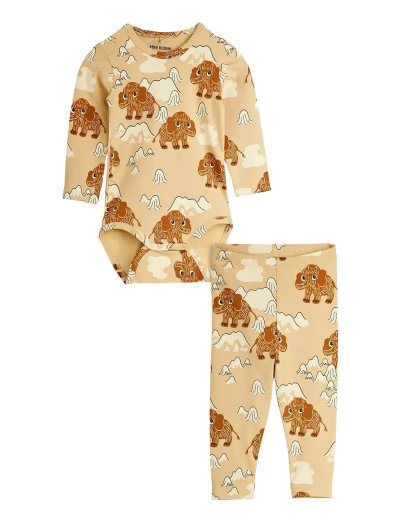 Detta babyset har ett lekfullt tryck och inkluderar en långärmad body och matchande leggings. Det mjuka tyget säkerställer en skonsam beröring mot känslig hud, vilket gör det idealiskt för vardagsbruk.