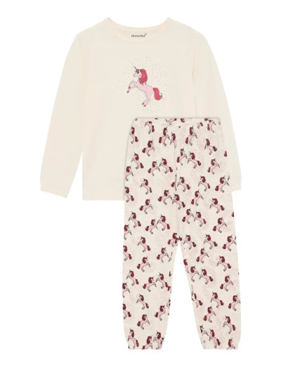 Sleepwear set from Minymo. The set includes a long-sleeved top and a pair of pants. The top features a round neckline, a gathered effect at the chest, and a delicate print on the chest. The pants have an all-over print, an elastic waistband, and elastic cuffs at the ankles. The set has a loose fit. Certified acc. to GOTS - organic CERES-0366