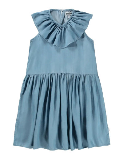 This sleeveless dress combines comfort and style, crafted from soft, lightweight fabric. Featuring a wide, flowing collar and a relaxed A-line shape with a ruffled skirt, it creates a playful look perfect for warm summer days. The convenient button closure at the back ensures easy wear. Ideal for both playful afternoons and special occasions.