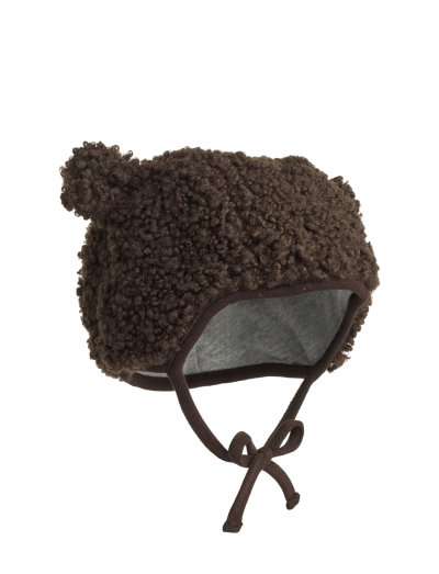 Bonnet from Molo with teddy bear ears. The bonnet is made of soft teddy fleece and can be tied tightly to the face with a string under the chin.