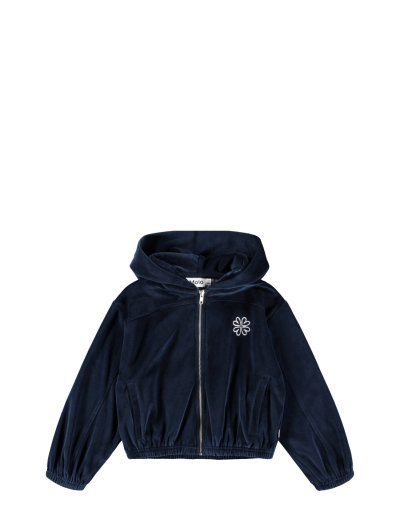 This velour hoodie from Molo has a zipper, a small white embroidered flower on the chest, a loose fit, and ribbed edges.