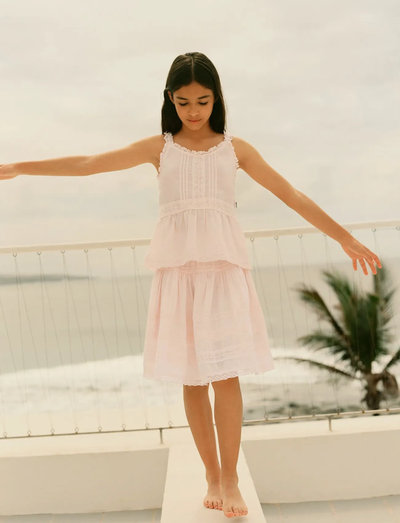 Soft cotton top featuring delicate matching lace edges. The lace at the waist highlights the silhouette while creating an elegant ruffled hem at the bottom. This top combines comfort and style, making it a perfect addition to any child's wardrobe. Ideal for daily wear or special occasions, it ensures a charming look that kids and parents will love.