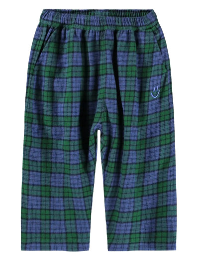 These pants from Molo are made of organic cotton. They have a loose fit, front and back pockets, and an elastic waist. A small embroidered smiling face is located at the pocket.