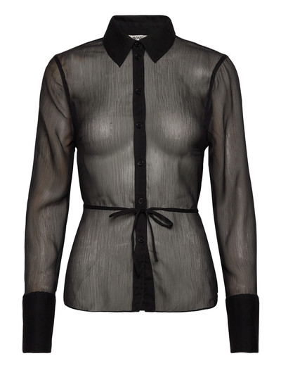 A long-sleeved shirt crafted from airy sheer fabric for a soft drape and lightweight feel. Designed with a pointed collar, curved hem, and flared cuffs with four buttons. Features front darts, a centre-back seam, and adjustable tie-back details that cinch the waist or hang loose for a relaxed silhouette.