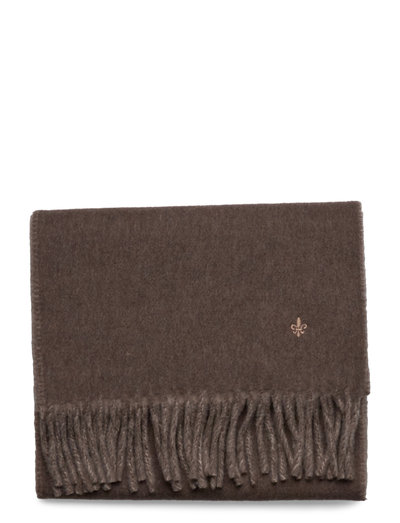 Denna halsduk erbjuder värme och en raffinerad look, med en subtil frans och ett litet, broderat emblem. Den dubbelsidiga konstruktionen ger extra isolering och en mjuk känsla.