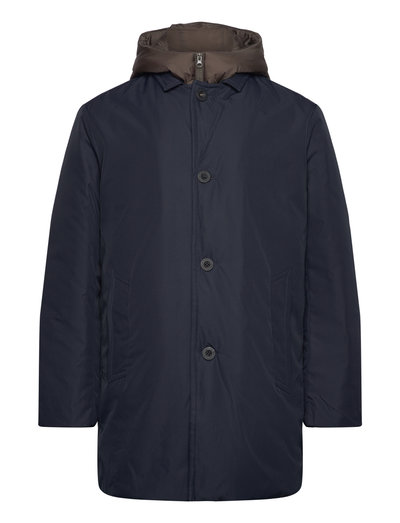This jacket has a sporty touch, designed in a regular fit with a slightly longer length. It has button closure, side pockets and removable hoodie in contrast fabric. Furthermore, It has storm cuffs, which makes them more resistance for the wind,