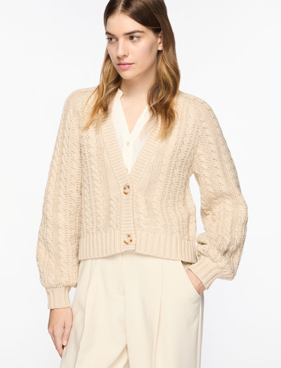 Grovstickad cardigan med V-ringning och knäppning framtill. Kabelstickningen och de böljande ärmarna ger en fin textur och volym till den korta silhuetten.