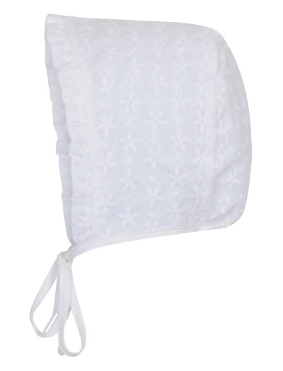 Denna bedårande babybonnet har fina broderier anglaise och en volangkant. Sommarhatten har en rund huvudform som säkerställer en bra passform. Den har en bred skugga runt om. Sommarhatten knyts under hakan med smala band så att den inte riskerar att falla av. Solhattens tyg har ett UV-skyddsfilter på 50+, så att barnets känsliga hud inte utsätts för solens skadliga UV-strålar.