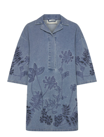 Denna klänning är tillverkad av denim och har tonala broderade blomdetaljer på kroppen och ärmarna. Siluetten är avslappnad och rak, och fulländas med en V-ringning, en liten krage och korta, rymliga ärmar.