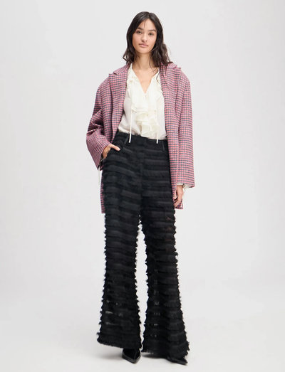 Fina fransar ger dessa lätt transparenta byxor en lekfull touch. Designade med dragkedja, bälteshällor och praktiska fickor, vilket ger en blandning av stil och bekvämlighet. Den vida benmodellen ger en bekväm passform.