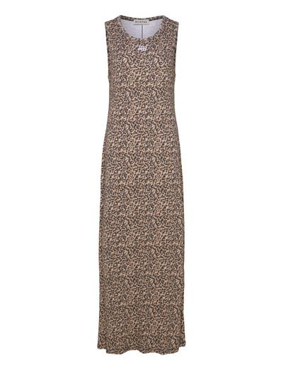 Denna ärmlösa maxiklänning erbjuder en strömlinjeformad silhuett. Det genomgående mönstret ger ett visuellt intresse, vilket gör den till ett mångsidigt val för olika tillfällen.