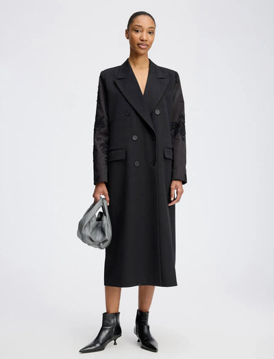 Paljett- och pärlbroderi lyfter denna långa, dubbelknäppta blazerkappa. Designen har en klassisk krage, fickor med lock och en rak, sofistikerad silhuett, vilket gör den till en framstående del.