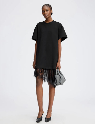 Denna klänning erbjuder en blandning av avslappnad komfort och raffinerad elegans. Den har en klassisk kortärmad T-shirtdesign, kompletterad med ett lätt överlager med en iögonfallande asymmetrisk spetsfåll. Bär T-shirten ensam för en avslappnad känsla, eller kombinera den med spetstoppen för att lyfta din look med en feminin touch.