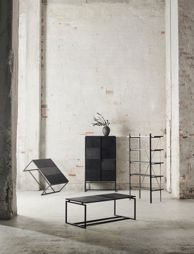 Hylderne på reolen er beklædt med henholdsvis et glat og smukt sort okselæder samt jern, som giver reolen et raffineret og industrielt touch med det rå jern.
