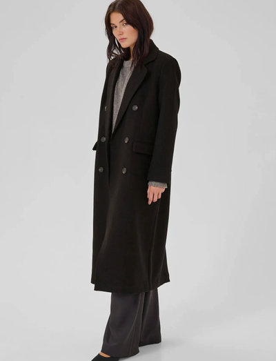 Denna halvlånga kappa har en raffinerad silhuett och är designad med en avslappnad passform. Ytterplagget med långa ärmar har en dubbelknäppt framsida, vilket ger en touch av klassisk skräddarkonst till din vardagsstil.