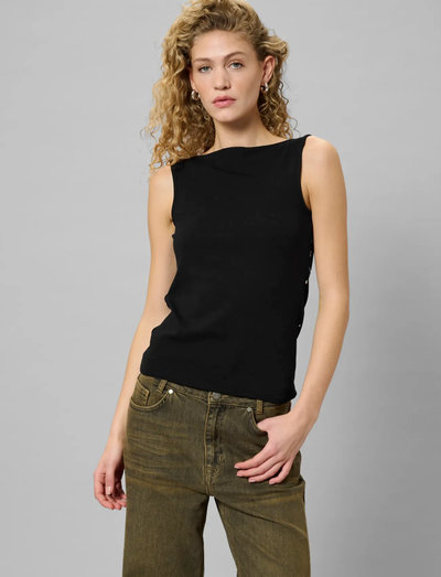 En kaskadhalsringning och skimrande utsmyckningar definierar detta ärmlösa linne. De iögonfallande detaljerna tillför en touch av glamour, vilket gör den perfekt för kvällsevenemang eller för att lägga till stil till vardagsoutfits.