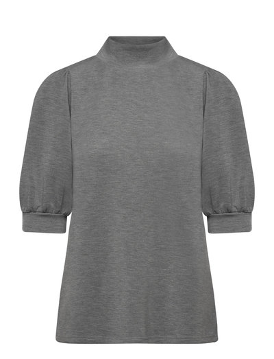 Den här snygga blusen har en hög halsringning och puffärmar. Den är gjord av en mjuk och bekväm blandning av modal, polyester och elastan. Blusen har en klassisk passform och är perfekt för avslappnad användning.