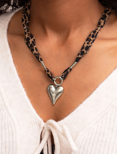 En touch av vild elegans definierar detta halsband, med ett hjärthänge. Designen har ett mjukt snöre med ett leopardtryck, vilket skapar en slående kontrast till det polerade hänget.