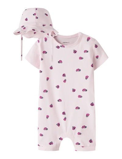 Detta set består av en solhatt och en sparkdräkt, tillverkad i mjukt och stretchigt jerseytyg, vilket säkerställer en behaglig känsla och obegränsad rörelsefrihet för ditt barn. Designen inkluderar praktiska tryckknappar och snörning.