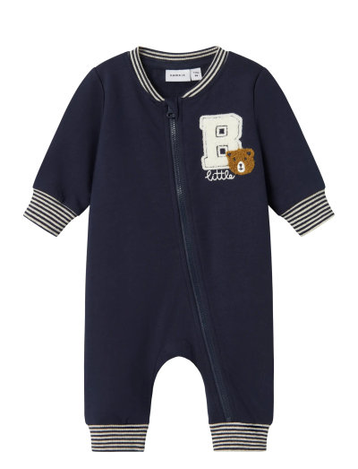 Denna långärmade overall har en charmig applikation med en björn och en mysig känsla. Overallen avslutas med randig ribbning vid ärmslut och halsringning, samt en praktisk dragkedja.