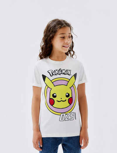 Den här t-shirten med korta ärmar har en rolig och färgglad design med ett stort Pikachu-tryck. Trycket är gjort med paljetter, vilket ger en touch av glitter till designen. T-shirten är gjord av mjuk och bekväm bomull, vilket gör den perfekt för vardagsbruk.