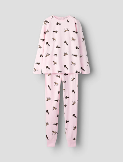 Det här pyjamassetet har ett lekfullt tryck över hela plagget och ger en bekväm nattsömn. Det mjuka jerseytyget är lätt och stretchigt, vilket ger rörelsefrihet. Avslutas med långa ärmar, ribbade fållar och en elastisk midja för extra komfort.