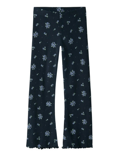 Trendiga byxor som ger en mjuk känsla och klär ditt barn bekvämt och coolt. Ribbstickningen har ett vertikalt, randigt mönster och bra elasticitet för en bekväm känsla och en tidlös look. Dessa utsvängda byxor har en åtsittande övre del och ben som blir bredare nedanför knäet. Trycket upprepas över hela produktens yta, och babylock-detaljer ger en speciell touch.
