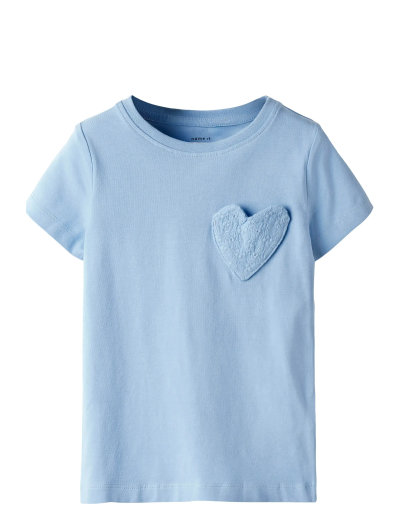 Den här t-shirten med korta ärmar är ett bra val för vardagsbruk. Den har en klassisk rund hals och en söt hjärtadetalj på framsidan. T-shirten är gjord av mjukt och bekvämt material, vilket gör den perfekt för barn.