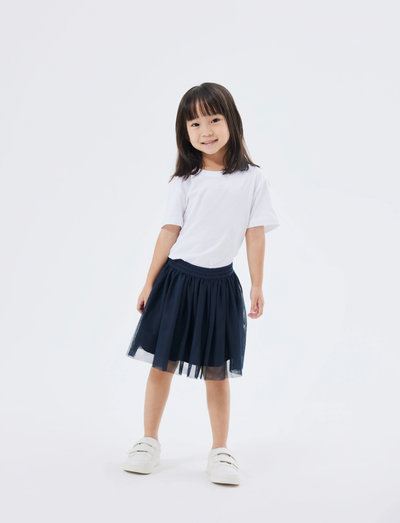 Den här kjolen är perfekt för fester och speciella tillfällen och har ett lätt tylltyg som skapar en elegant, nätliknande look. Designad med en elastisk midja för en bekväm passform, den har också ett foder av återvunnen polyester för extra täckning.