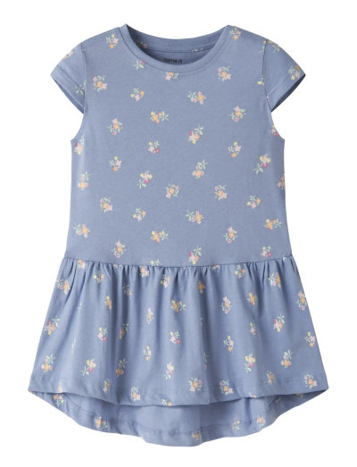 Denna kortärmade klänning har ett blommönster över hela plagget och är ett charmigt tillskott till varje barns garderob. Det mjuka jerseytyget säkerställer en bekväm passform som tillåter stor rörelsefrihet, vilket gör den idealisk för vardagsbruk.