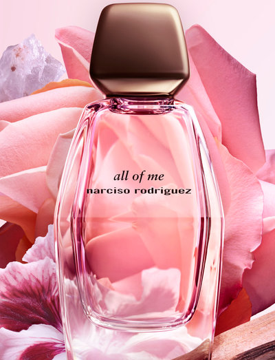 All of Me - unik inom parfym dam - är en hyllning till individualitet och självuttryck och utmanar klassiska dofttraditioner genom att kombinera lyxiga rosor och djärv geranium bourbon, som ofta förekommer i herrdofter. I denna unika kombination av rosor och geranium har Narciso Rodriguez ikoniska doftsignatur återuppfunnits med ett ackord av delikat och oemotståndlig mysk. Sex olika noter av mysk blandas för att skapa en lockande och intim doftupplevelse som varsamt omfamnar huden. Varje not lyfter fram en annan sida av den mångfacetterade buketten av färgglada blommor.