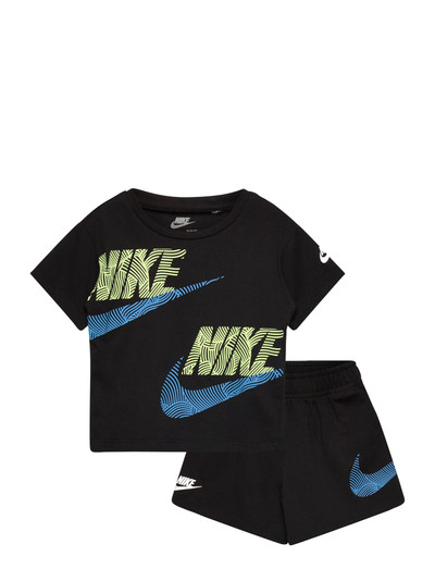Detta set med shorts har en klassisk t-shirt och matchande shorts, perfekt för vardagsbruk. Toppen har ett djärvt grafiskt tryck, medan shortsen har en elastisk midja för en bekväm passform.