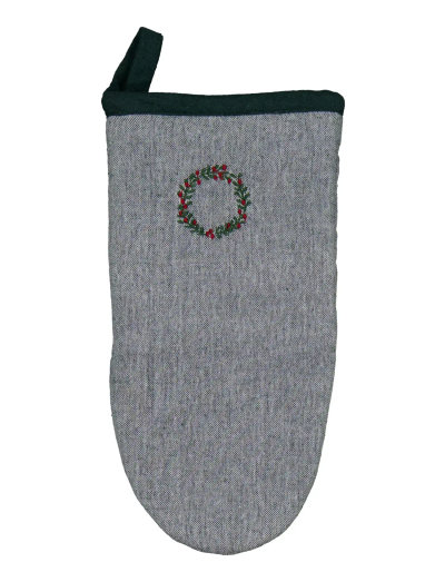 Fantastiska ugnsvante med grodgrepp i chambray och dekorativt broderad krans av lingonris med bär, ugnsvanten är gjord 100% årtervunnet materialt för att vi vill värna om vår natur.