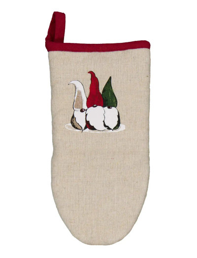 Denna fantastiska ugnsvante med grodgrepp i tyg som har fin slät linnestruktur och ett vackert tryck av tomtar, ugnsvanten är gjord 100% årtervunnet materialt för att vi vill värna om vår natur.