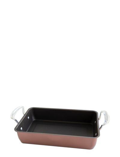 Large Roaster är en ugnsform i koppar med en non-stick yta som gör att maten lossnar och formen blir enkel att rengöra. Går att använda i både ugnen och på spisen. Tillverkad av aluminiserad stål med polerade handtag i gjuten aluminium. Handtagen är designade för att enkelt kunna greppa, även med grytvantar.