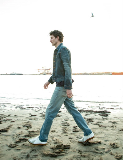 Den här slim-fit denimjackan definieras av en vintage-inspirerad mörk mellanblå tvätt och har asymmetriska bröstfickor och signaturbroderi på oket bak. Tvätten återskapar autentiska slitagemönster, inklusive skarpa honeycomb-effekter vid ärmarna och platta nötningar vid armbågar och krage. De bevarade manschetterna med torr look ger en slående kontrast mot den stela 14,2 oz. denimens uttalade vertikala slubbar, medan subtila crosshatch-detaljer framträder i highlights.