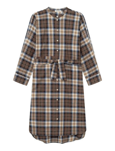 Denna klänning har ett tidlöst tartanmönster och är ett mångsidigt tillskott till varje garderob. Designen har en mandarin-krage och knäppning framtill, vilket ger en blandning av klassisk och modern stil. Ett matchande bälte smickrar midjan, medan ryggpilar säkerställer en smickrande passform. Den rundade fållen, som är något längre baktill, ger en modern touch.