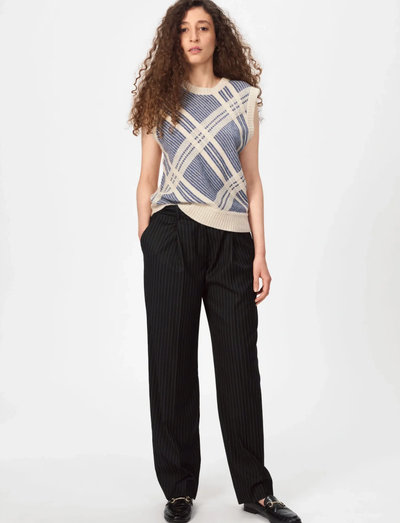 Med ett distinkt rutmönster ger denna stickade väst en touch av visuellt intresse till vilken outfit som helst. Den ärmlösa designen gör den idealisk för lager-på-lager, medan den ribbade fållen ger en subtil texturkontrast.