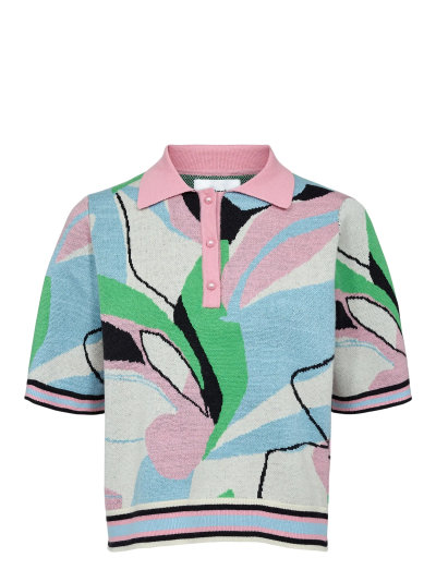 Denna stickade pikétröja har ett livfullt, abstrakt mönster som ger en distinkt look. Designen har en klassisk pikékrage och en knappslå, vilket kombinerar traditionell stil med modern känsla.