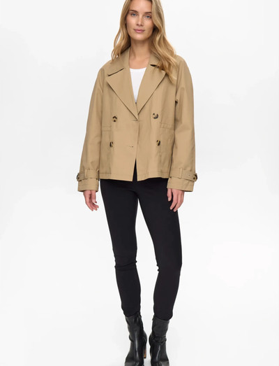 Denna korta jacka har en dubbelknäppt design som ger en klassisk silhuett. Den har även en krage och justerbara flikar vid ärmsluten, vilket förstärker det skräddarsydda utseendet.