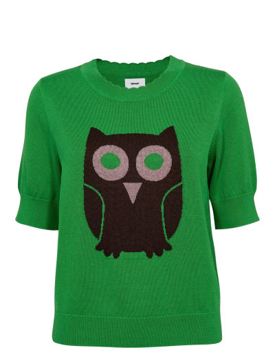 Denna kortärmade tröja har en lekfull intarsia-stickning som ger en finurlig touch till vilken outfit som helst. Designen har en subtilt texturerad stickning och en delikat, vågig halsringning.