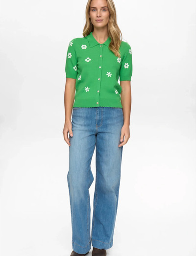 Denna kortärmade kofta har knappar och ger möjlighet till mångsidig styling. Kragen och blomstermönstret ger en sofistikerad touch till detta stickade plagg.
