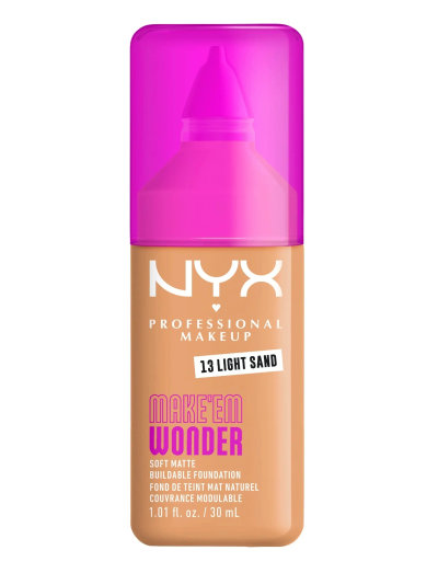 NYX Professional Makeup Make'em Wonder foundation är en mjuk, matt och byggbar formula som får dig att undra om det är foundation eller om det verkligen är din egen hud. Denna foundation är berikad med hudvårdsingredienser och ger full täckning men känns ändå viktlös på din hud. Den håller hela dagen och ser ut som din hud – bara slätare, jämnare och mer strålande. Formulan är berikad med guaranaextrakt, känt för att ge lyster, och hyaluronsyra för omedelbar fukt utan att formulan klumpar sig. Bygg upp formulan till den täckning du önskar, oavsett om du föredrar en no-makeup-look eller full glam. Formulan bleknar inte, fäller inte, är svettresistent, vattenfast och ser strålande ut hela dagen.