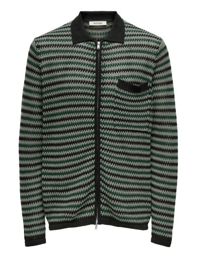 Denna cardigan har en distinkt strukturstickning som ger en stilren och sofistikerad look som passar både för professionella och avslappnade sammanhang. Designen har en delad halsringning och korta ärmar, vilket gör den till ett mångsidigt tillskott i varje garderob. Den har också en praktisk bröstficka och en dragkedja för enkel användning.